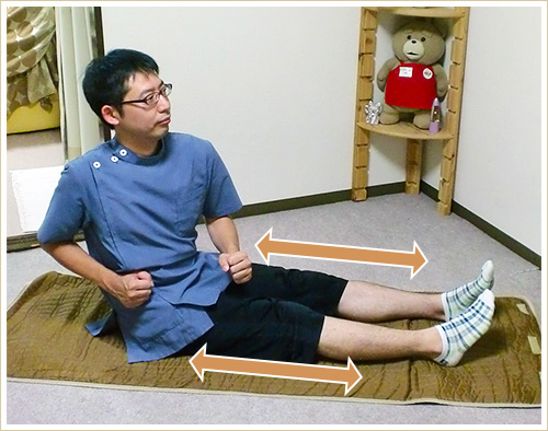 膝を伸ばしたまま、お尻で前に10歩いき、そこから今度は10歩戻って行きます。